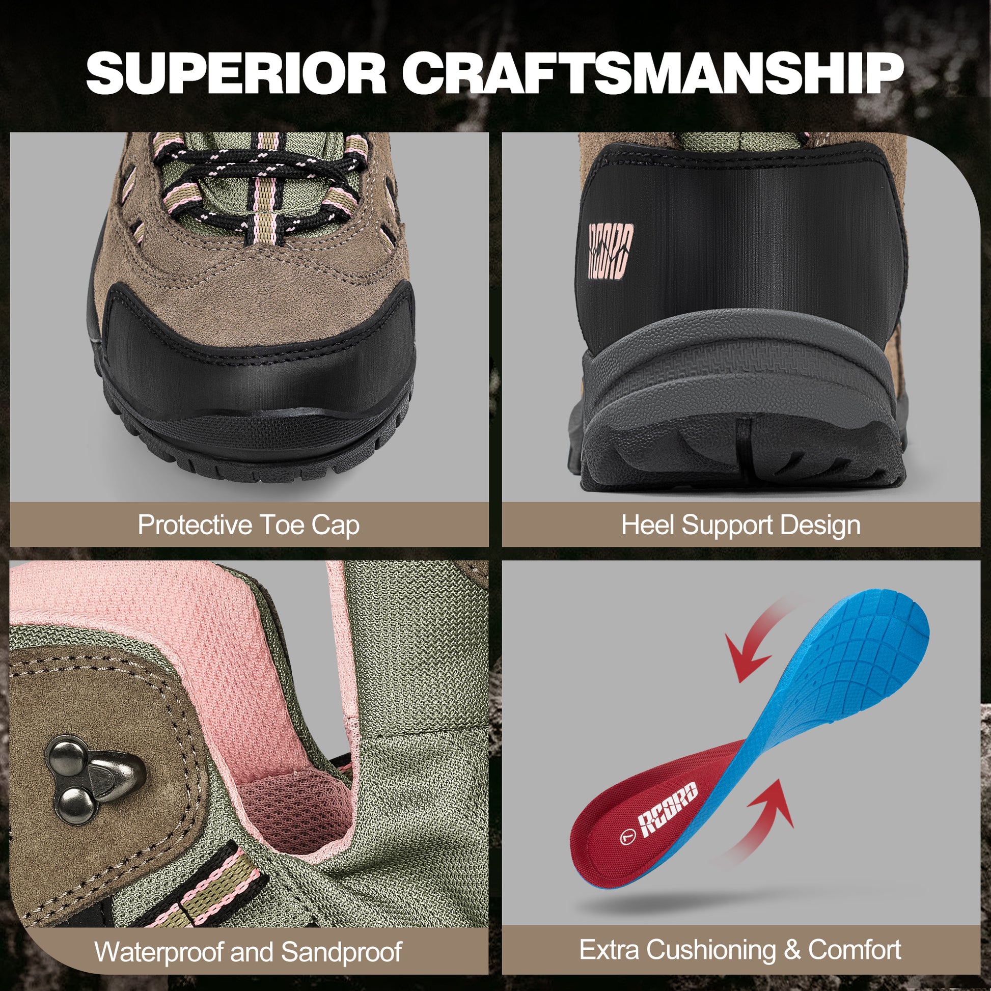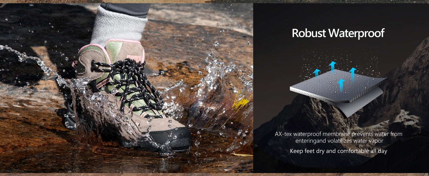 • WATERPROOF & BREATHABLE - This women's waterproof hiking boots features a waterproof membrane that seals out water and lets moisture escape, which keeps you dry and comfortable no matter the conditions. Mesh upper for increased breathability.